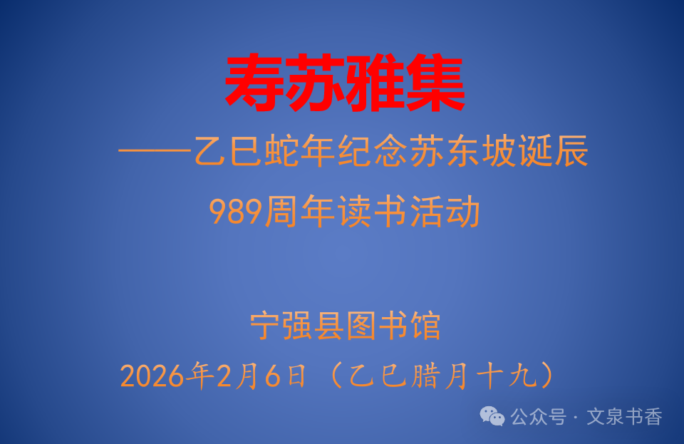 在苏东坡诞辰即将到来之际,宁强县图书馆将在2026年2月6日(农历腊月十九)举办“寿苏雅集”——乙巳蛇年纪念苏东坡诞辰989周年读书活动。