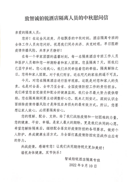 隔离不隔爱。9月10日,正逢我国传统中秋佳节,智诚铂锐隔离酒店工作专班为医学观察的隔离人员送上了中秋祝福。