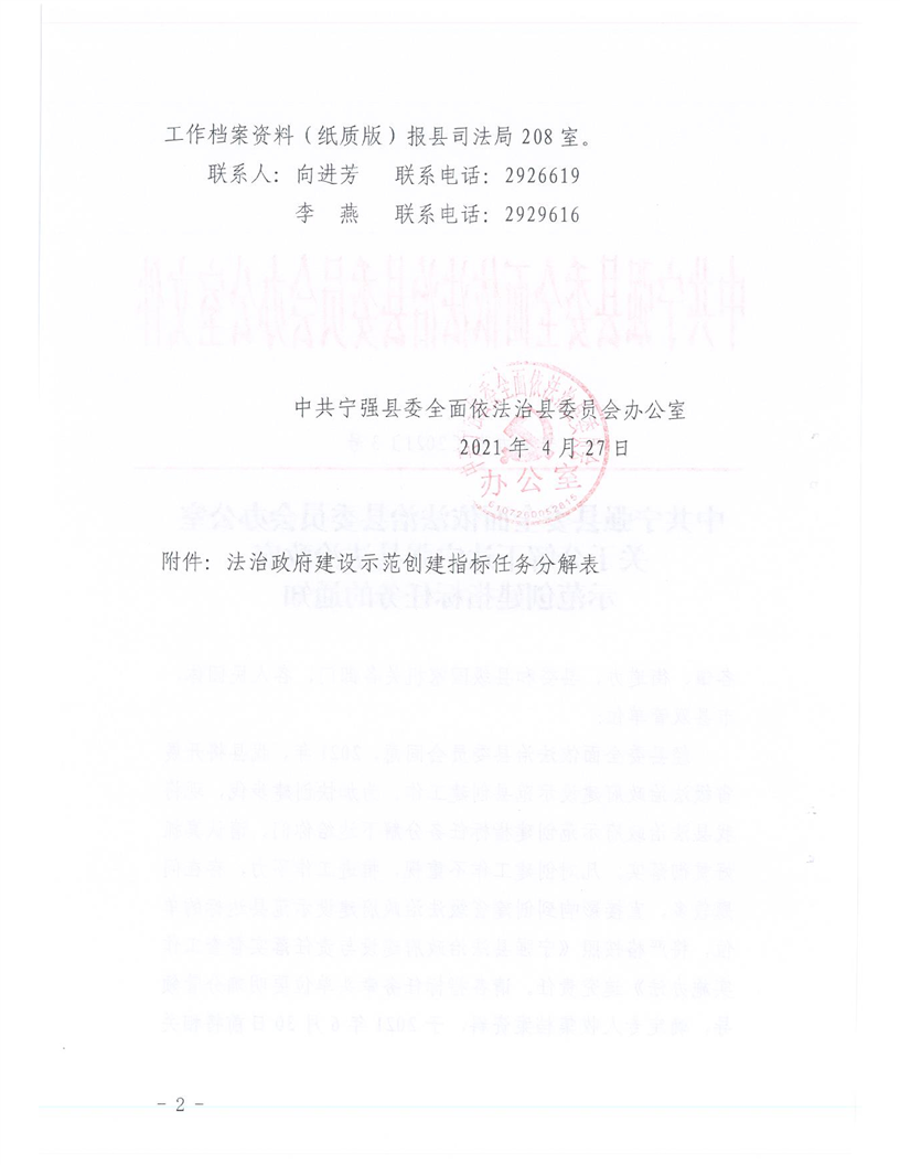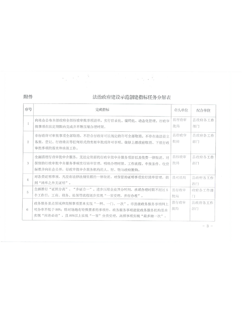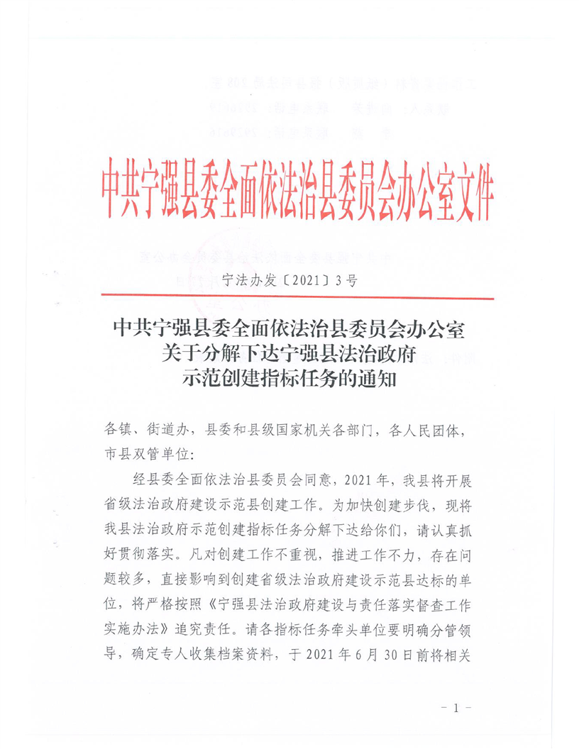 中共宁强县委全面依法治县委员会办公室 关于分解下达宁强县法治政府示范创建指标任务的通知