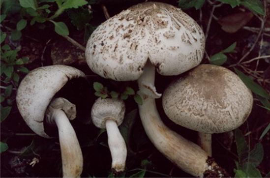 又名毒菌伞。子实体中等大;菌盖初期扁半球形,后期渐平展,直径7.5—14cm,表面褐色或棕褐色,散布白色至污白色的小斑块或颗粒状鳞片,老后部分脱落,盖缘有明显的条棱,潮湿时表面粘;菌肉白色;菌褶白色,离生,不等长;菌柄圆柱形,表面有小鳞片,内部松软至空心,基部膨大,着生几圈环带状的菌托;菌环一般生长在中下部。夏秋季在阔叶林或针叶林中地上成群生长。含有毒蝇鹅膏菌相似的毒素及豹斑毒素等毒素。食后半小时至6小时之间发病。主要表现为副交感神经兴奋,呕吐、腹泻、大量出汗、流泪、流涎、瞳孔缩小、感光消失、脉搏减慢、呼吸障碍、体温下降,四肢发冷等。中毒严重时出现幻视、谵语、抽搐,昏迷,甚至有肝损害和出血等。一般很少致死,及时用阿托品疗效较好。可利用来毒杀苍蝇等昆虫,用于农林业生物防治。