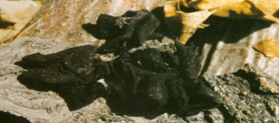 子囊盘小,黑色,呈浅盘状或浅杯状,具短柄或几乎无柄;个体大者盖边缘呈波状,上表面光滑,下表面粗糙、有棱纹,湿润时有弹性,呈木耳状或叶状,干燥后质硬,味略苦涩。阔叶林立木上丛生,含光敏性毒素。