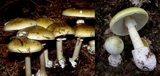 也称为死亡帽、鬼笔鹅膏。子实体中等至很大;菌盖直径5—15cm,初球形或半球形,后变成扁平;菌盖颜色以灰色、微黄、橄榄绿为主,雨后颜色往往更淡,湿润时黏,表皮容易脱落;菌环白色,自由下垂;菌托白色,杯状或花苞状。夏秋季单生或散生于阔叶林中地上。剧毒,主要的毒性物质为α-鹅膏蕈碱,主要对肝脏和肾脏造成致命伤害,目前没有任何已知的决定性解毒剂被发现,致死率极高。