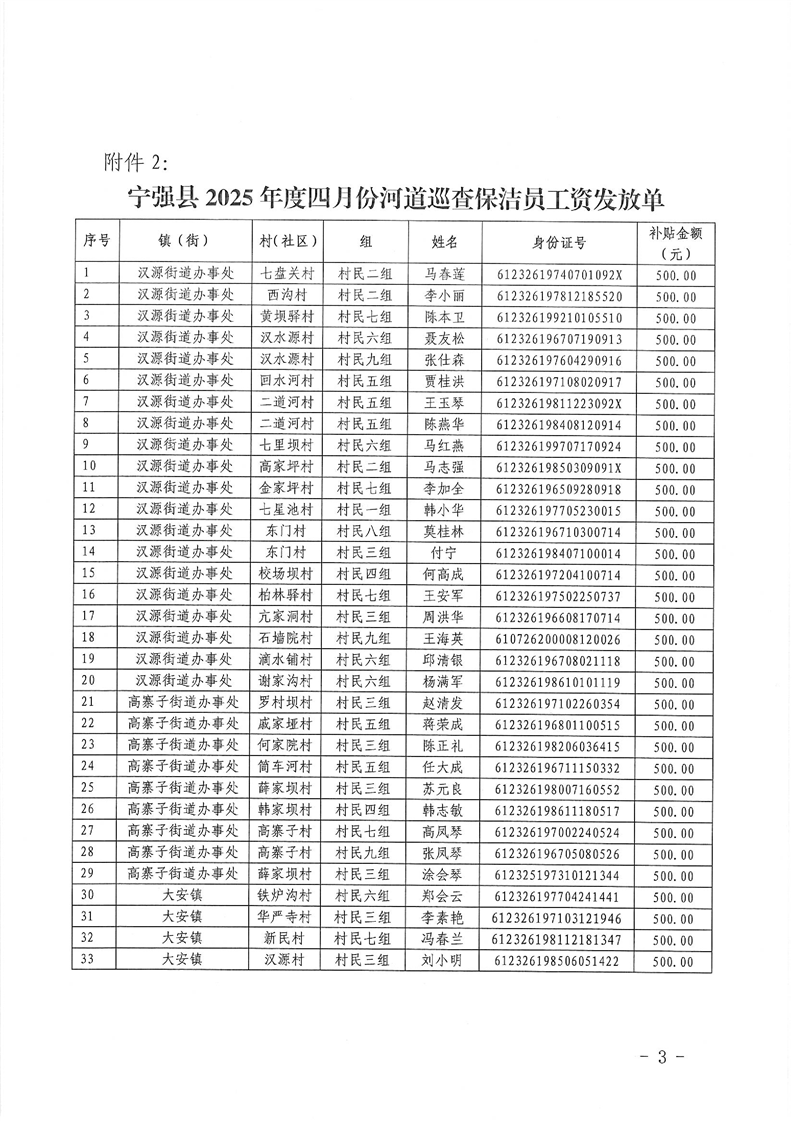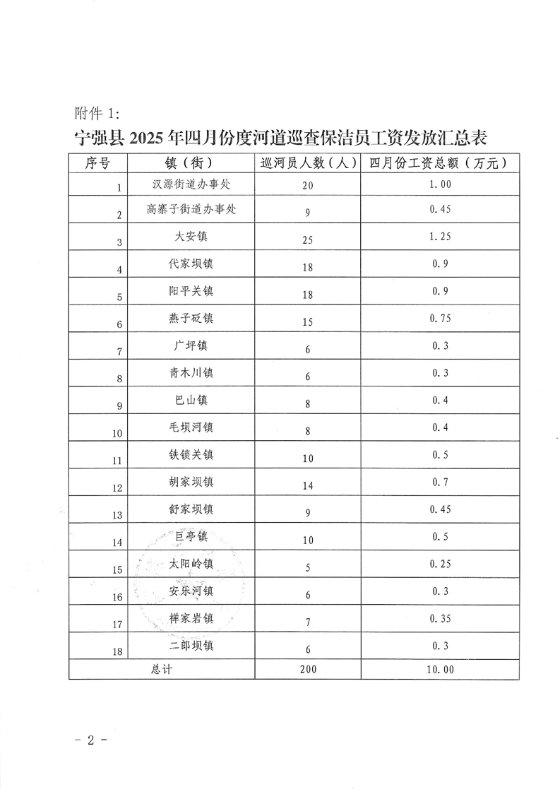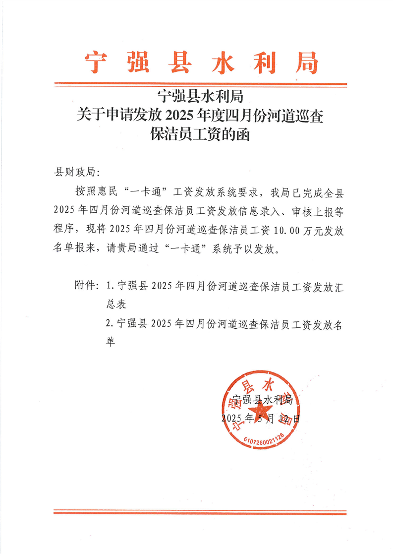 宁强县水利局关于申请发放2025年度四月份河道巡查保洁员工资的函