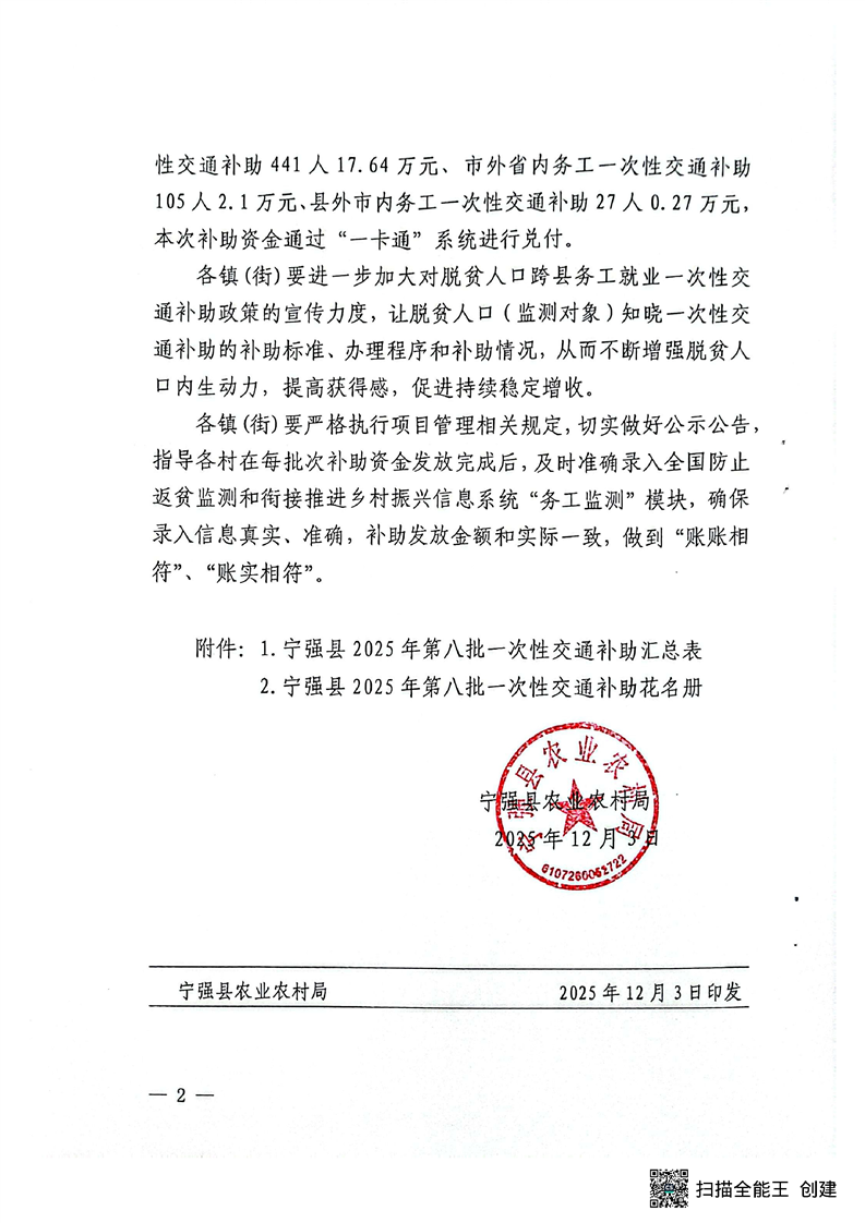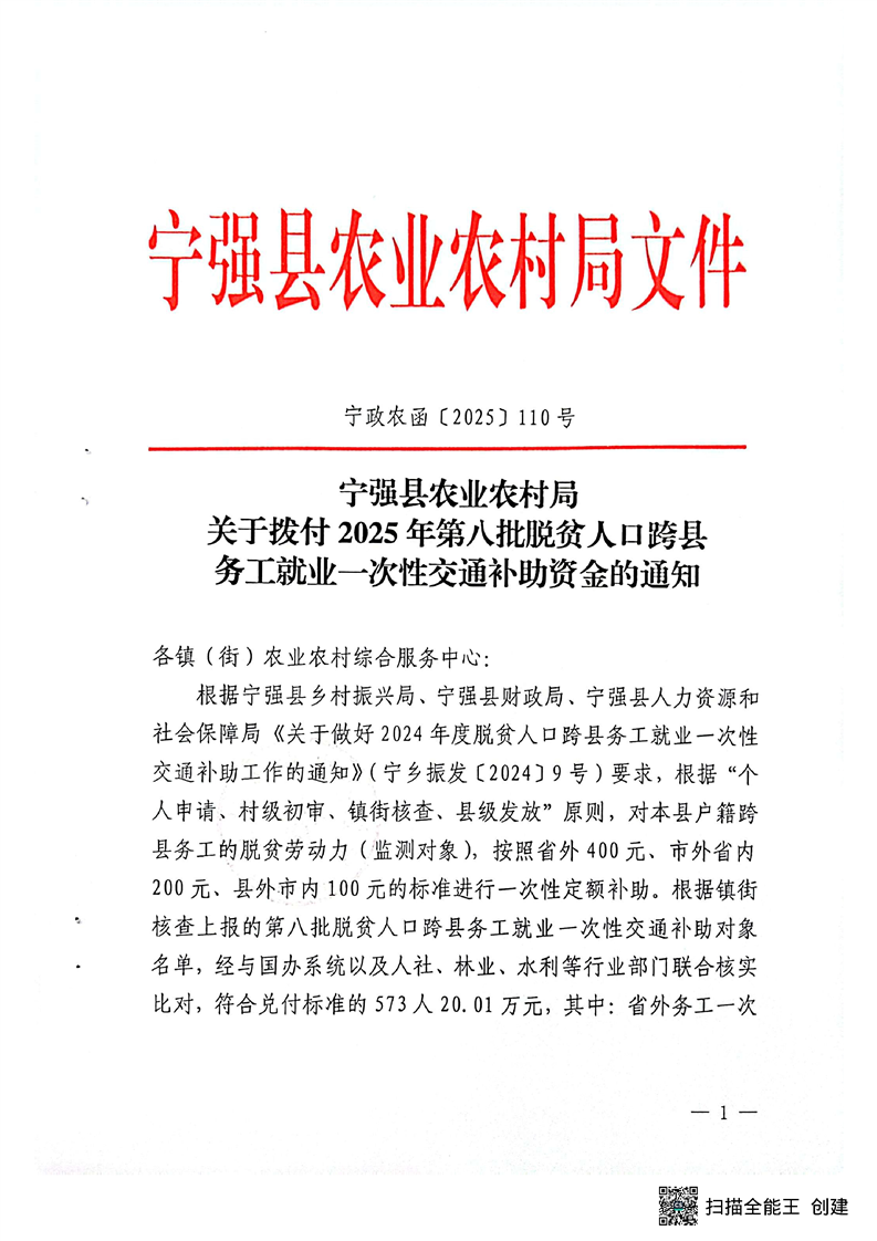 宁强县农业农村局关于拨付2025年第八批脱贫人口跨县务工就业一次性交通补助资金的通知