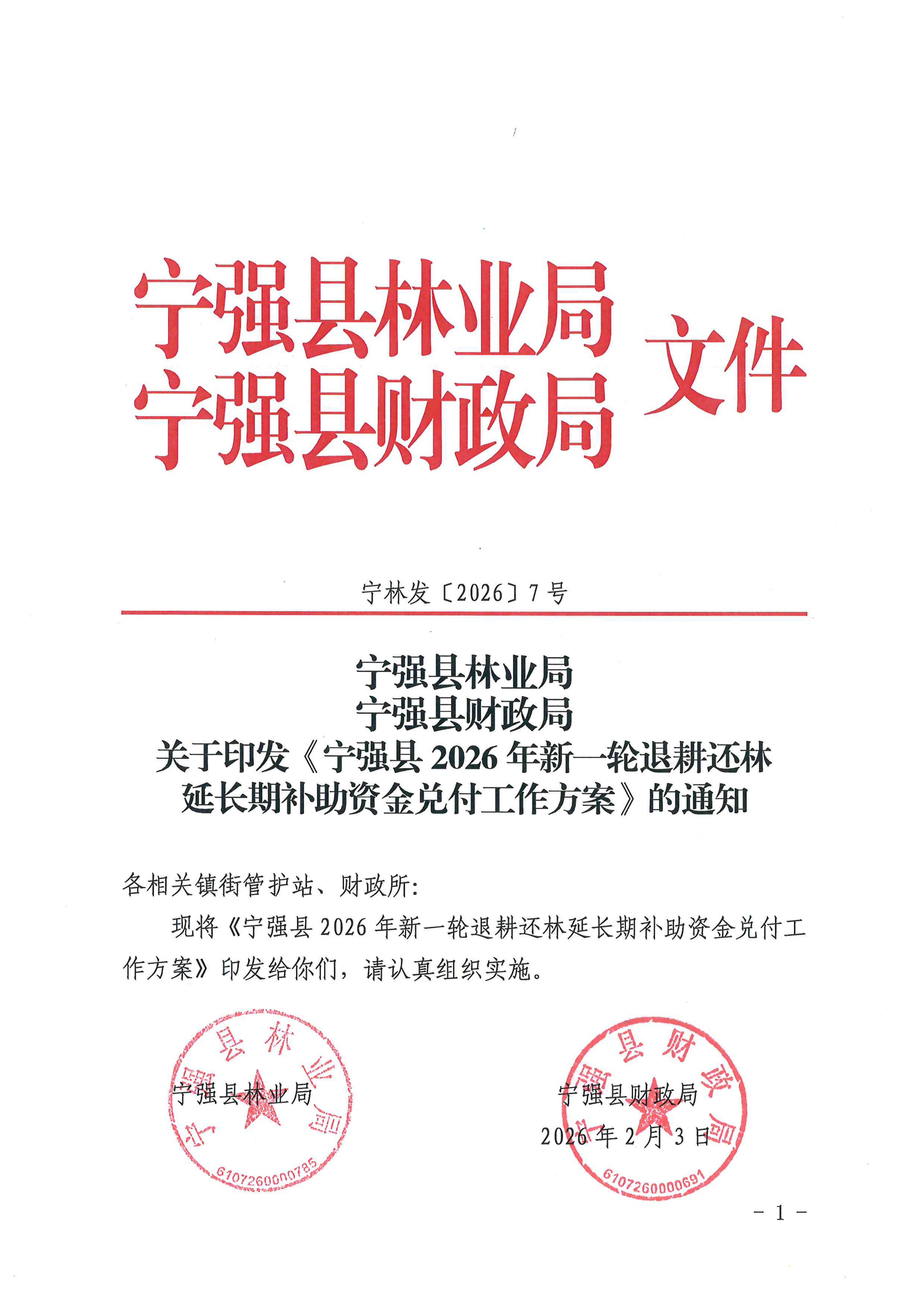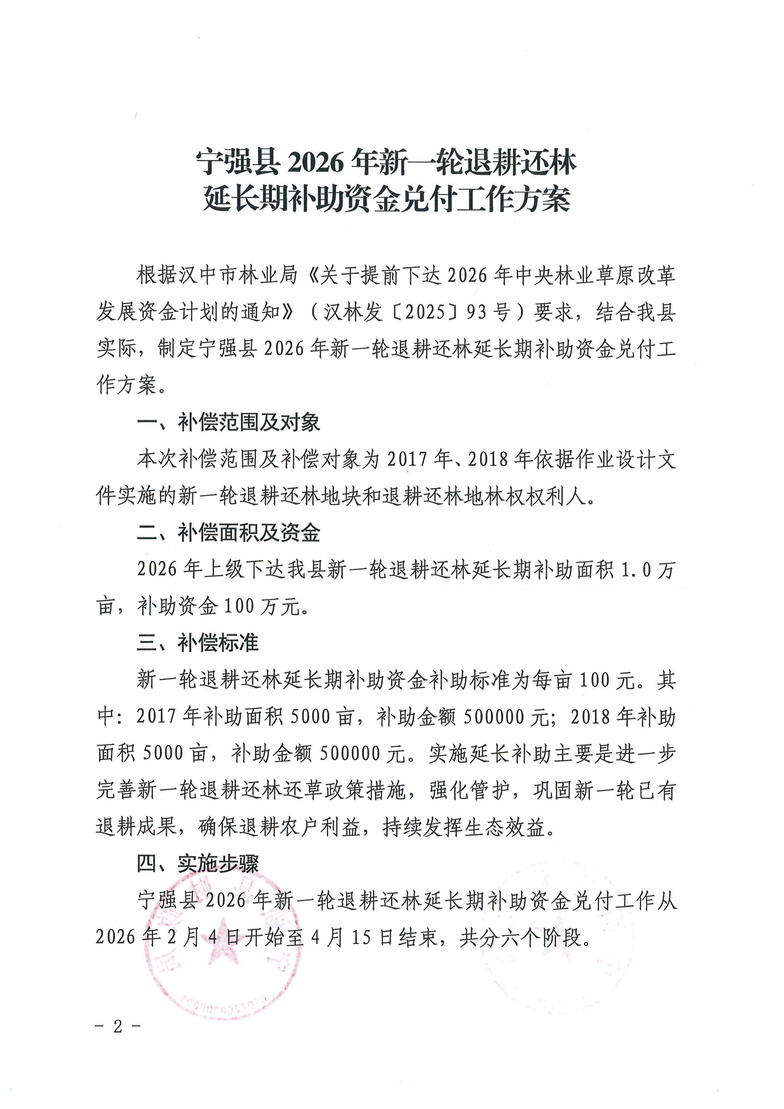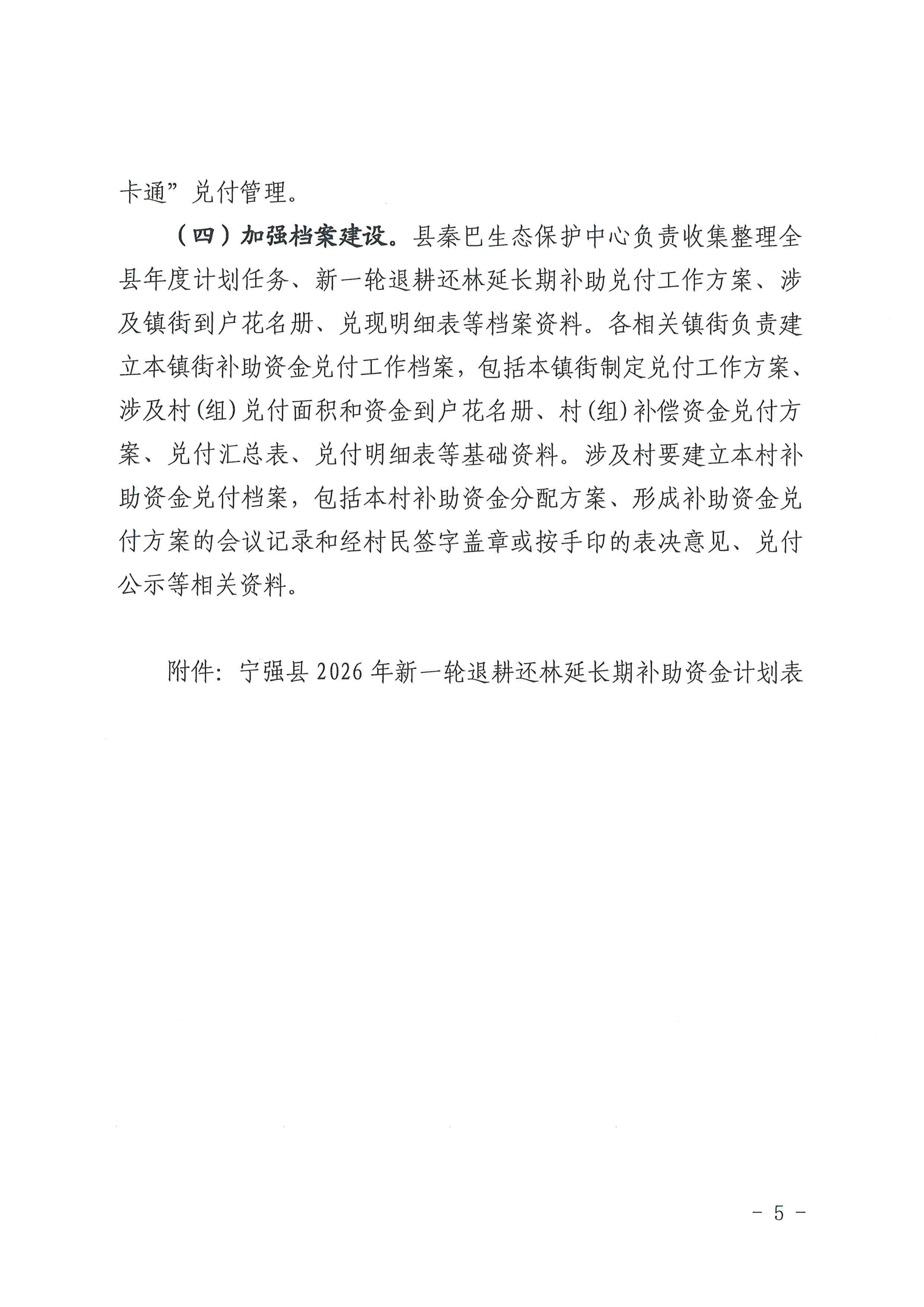 关于印发《宁强县2026年新一轮退耕还林延长期补助资金兑付工作方案》的通知
