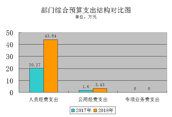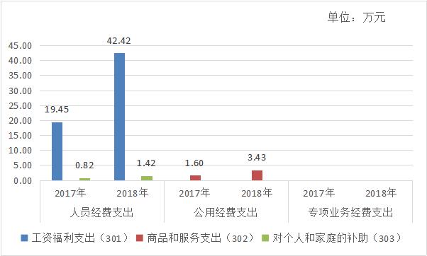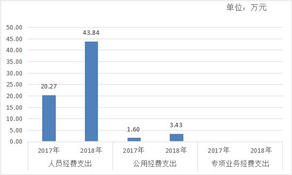2018年一般公共预算当年拨款支出预算47.27万元,比上年增加25.4万元,同比增加116.1%,原因同上。其中:人员经费支出43.84万元,比上年增加23.57万元,同比增加116.3%,原因是增加4名工作人员;公用经费支出3.43万元,比上年增加1.83万元,同比增加114.4%,原因同上;专项业务经费支出0万元,无增减,原因是无专项业务经费。