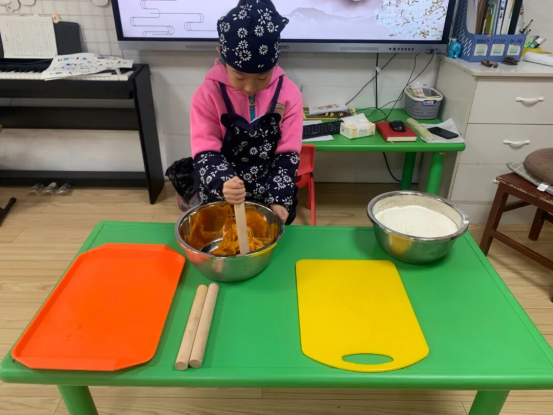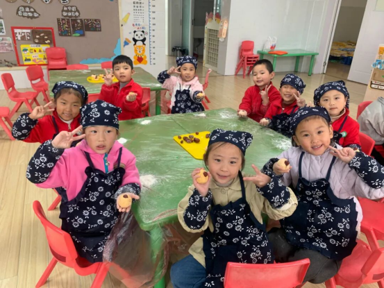 最热闹的是大班制作的“南瓜糯米糕”,孩子们在老师指导下蒸南瓜、磨糯米粉、和面、摆大枣。当热气腾腾的糕点端上桌,软糯清甜里满是孩子的心意。