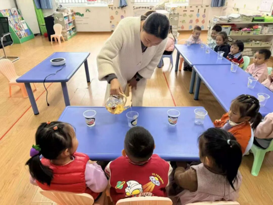 小班组幼儿围绕传统文化体验展开活动,把自己做的菊花装饰和菊花茶送给长辈,用稚嫩的声音说“爷爷、奶奶节日快乐”,传递感恩心意。