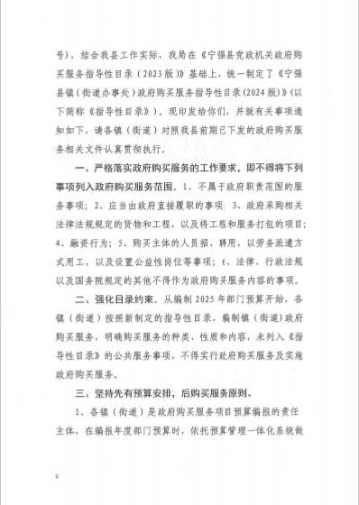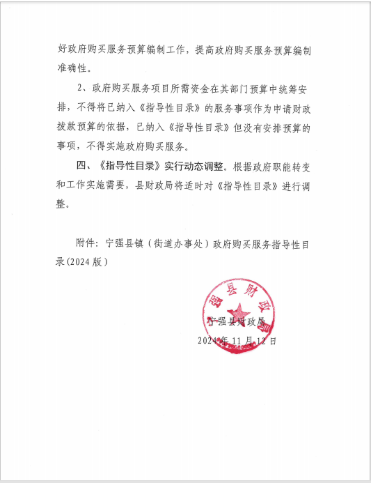 宁强县财政局 关于印发《宁强县镇(街道办事处)政府购买服务指导性目录(2024版)》的通知