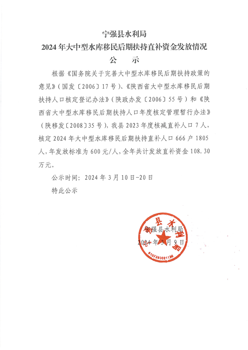 宁强县水利局2024年大中型水库移民后期扶持直补资金发放情况公示