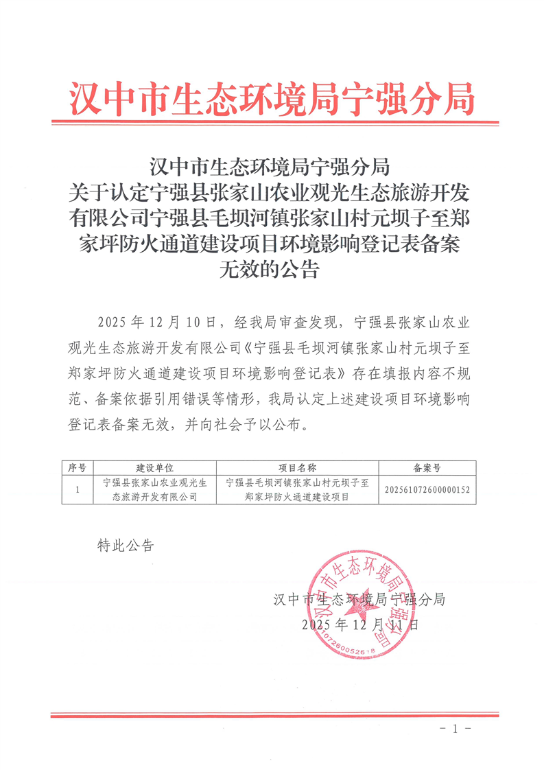 汉中市生态环境局宁强分局关于认定宁强县张家山农业观光生态旅游开发有限公司宁强县毛坝河镇张家山村元坝子至郑家坪防火通道建设项目环境影响登记表备案无效的公告