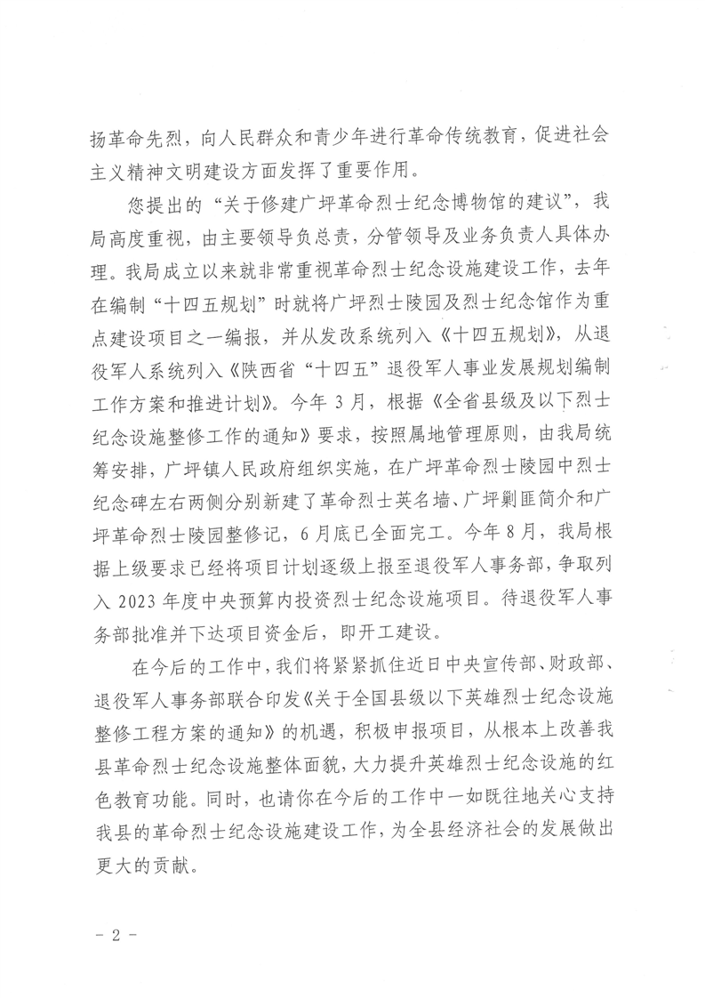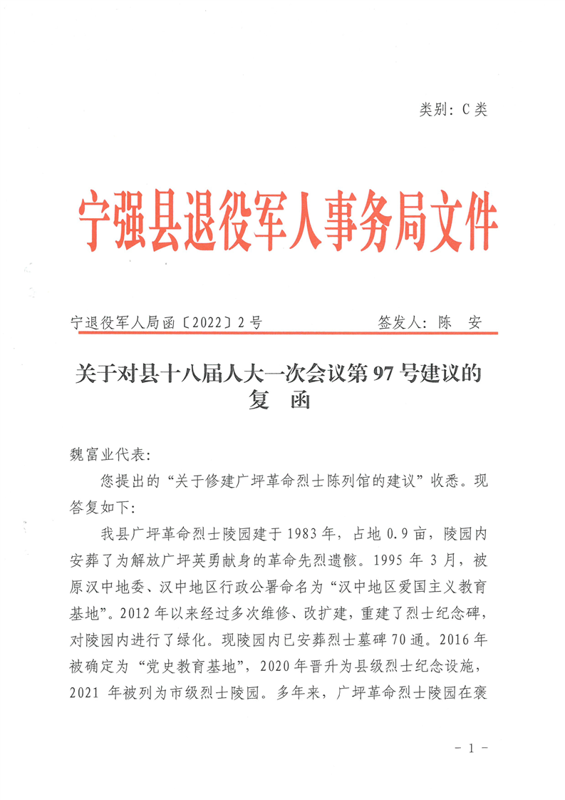 宁强县退役军人事务局关于对县十八届人大一次会议第97号建议的复函