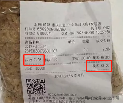 近日,重庆消费者刘先生在永辉超市重庆江北区金源时代店购买了标价7.96元的淡虾米。刘先生在结算时发现,超市将本该支付的7.96元向上取整为8元,这一“反向抹零”操作让他深感不满。