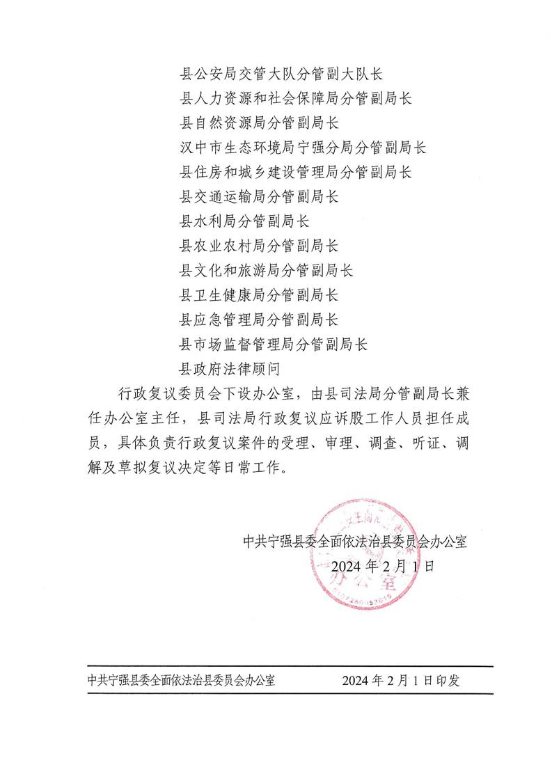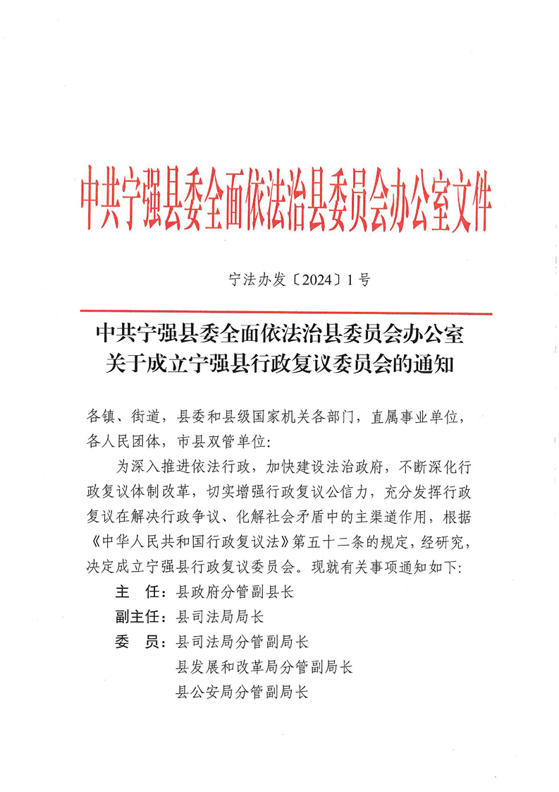 中共宁强县委全面依法治县委员会办公室关于成立宁强县行政复议委员会的通知