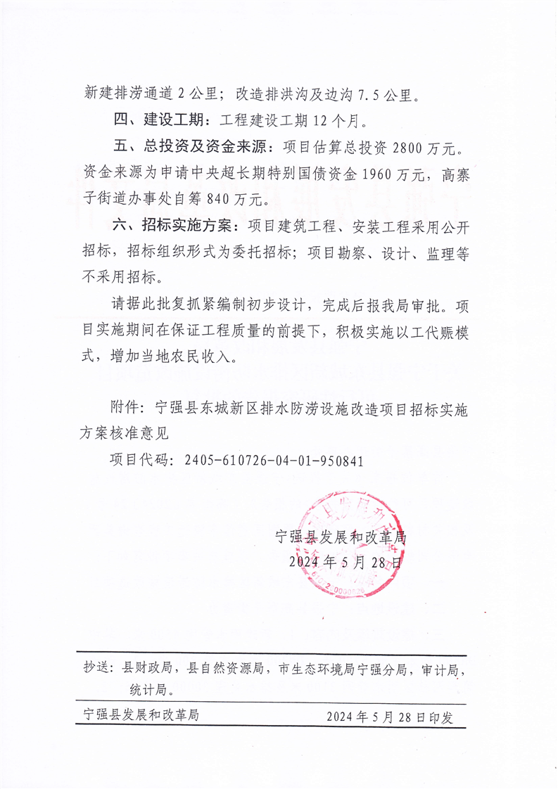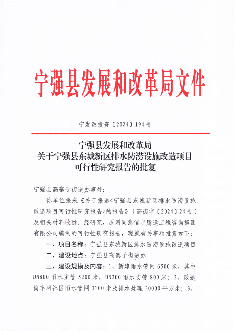 关于宁强县东城新区排水防涝设施改造项目可行性研究报告的批复